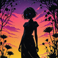 The image depicts a silhouette of a young woman standing on what appears to be a rocky ground with plants around her, possibly in the evening or night given the warm colors that suggest sunset or twilight. She is wearing a long dress and has her hair pulled back, revealing her face in profile. Her expression is serious and contemplative as she gazes off into the distance. In the background, there are silhouettes of trees against a sky with clouds, enhancing the serene atmosphere of the scene. The overall style of the image is illustrative and could be associated with fantasy or concept art.