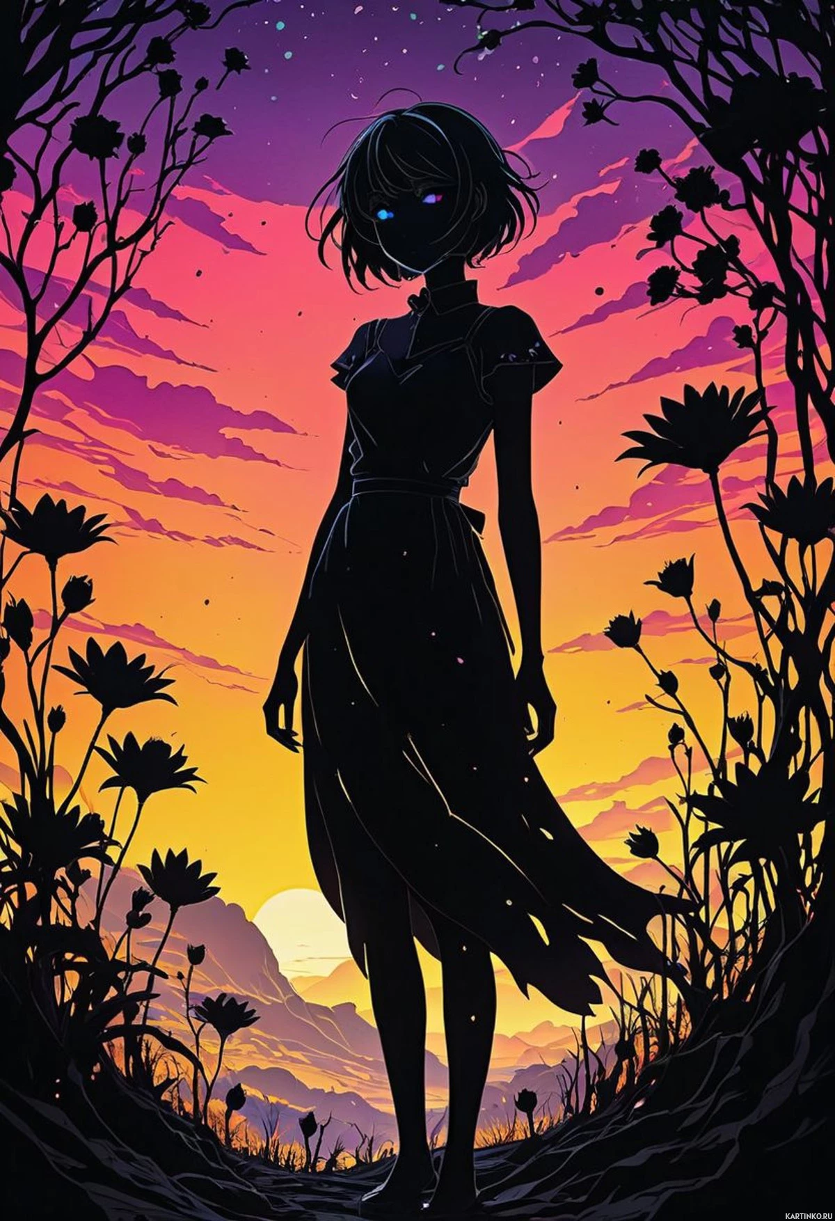 На картинке – силуэт молодой женщины, стоящей на каменистой местности, окруженной растениями. Возможно, это вечер или ночь, судя по тёплым оттенкам, намекающим на закат или сумерки. На ней длинное платье, волосы зачесаны назад, открывая её лицо в профиль. Выражение её лица серьезное и задумчивое, она смотрит вдаль. На заднем плане – силуэты деревьев на фоне неба с облаками, что усиливает безмятежную атмосферу сцены. Общий стиль картинки – иллюстративный, и он может ассоциироваться с фэнтези или концепт-артом.