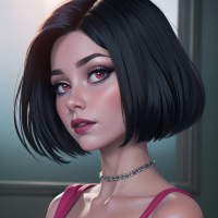 На картинке изображен трехмерный персонаж девушки с темными волосами и яркими красными глазами, в розовой кофте. У нее короткая стрижка и чокер на шее.