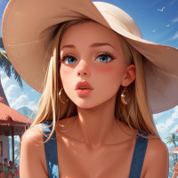 Это картинка с героиней из видеоигры. У неё светлые волосы, соломенная шляпа, солнцезащитные очки и джинсовый комбинезон с открытым топом. Она стоит, положив одну руку на бедро, а другую нежно придерживая бедро. Выражение лица расслабленное, и она смотрит прямо в камеру. На заднем плане пальмы и чистое голубое небо, создающие ощущение тёплого климата.