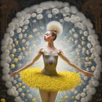 In the image, a female figure adorned in a vibrant yellow tutu and a matching headpiece stands poised on one leg. She extends her arms outwards, with her right hand grasping an orange flower that appears to be made of dandelion seed heads. The background is stark black, providing a striking contrast to the figure's bright costume. To the left and right of the figure are scattered more orange flowers, also constructed from dandelion heads. These elements together create a surreal and whimsical scene that seems both naturalistic yet otherworldly in its composition.