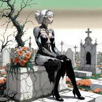 На картинке изображена девушка с белыми волосами и в готическом наряде, сидящая на стене кладбища. На ней черные перчатки, туфли на высоком каблуке, темный корсет и черные брюки. На заднем плане – множество покосившихся надгробий и крестов. У подножия одного из надгробий лежат цветы. Общая атмосфера картинки – печальная, а мягкий свет указывает на время сумерек или раннего утра.