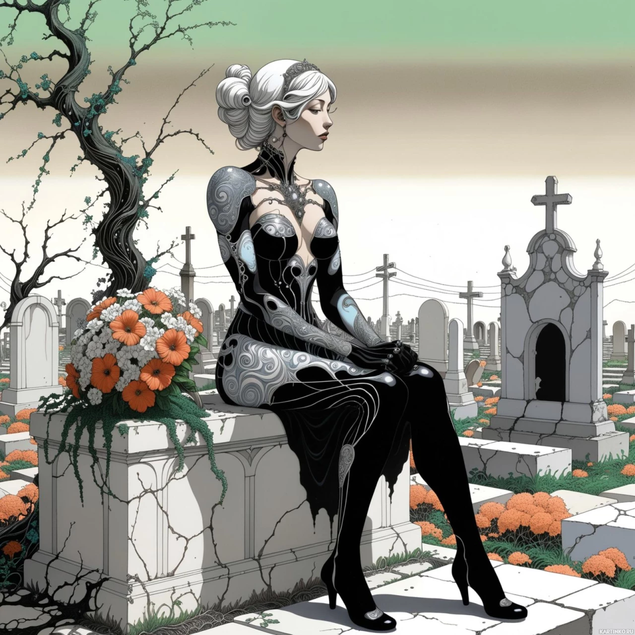 цветы | Скачать аватары с цветком | Flowers | Иллюстрация: Седая женщина на краю надгробия