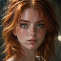 На картинке изображена девушка с рыжими волосами, уложенными мягкими волнами. У неё светлая кожа с лёгким румянцем и веснушками на лице. Она смотрит прямо в камеру с нейтральным выражением. Освещение на фотографии мягкое, что указывает на съёмку на открытом воздухе при естественном свете. На ней, похоже, лёгкий топ с открытым плечом.