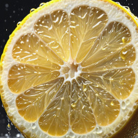 The image shows a close-up of a fresh, whole lemon with its skin intact. It appears to be partially peeled, revealing the inner flesh and juice that is oozing out. There are no visible seeds or pulp inside the lemon. In terms of background, there's not much to describe as it seems focused on the lemon itself with a neutral or dark backdrop, possibly resembling a countertop or table. The lighting in the image highlights the lemon's