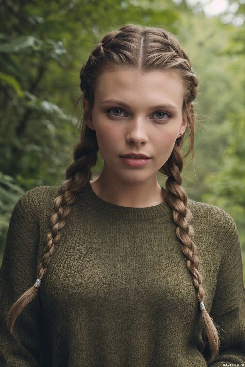 На картинке запечатлён человек, позирующий для портрета на фоне, напоминающем лесной пейзаж. У него длинные заплетённые волосы и тёмный свитер или топ. Он смотрит прямо в камеру с нейтральным выражением лица. Освещение указывает на то, что это либо поздний вечер, либо конец дня, ведь сквозь деревья и листву пробивается мягкий свет.