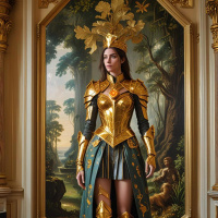 The image shows a person dressed in elaborate armor and regal attire, standing upright against a backdrop of classical artwork featuring trees and figures. The individual's hair is styled to drape over their shoulders, while their facial features are visible. They appear to be wearing eye makeup and jewelry that adds to the grandeur of their appearance. The armor includes elements such as a breastplate with intricate detailing and shoulder guards. A headdress with plumes or feathers adorns the person's head, contributing to the overall majestic look. The setting suggests a formal event or presentation, possibly related to historical reenactment or thematic performance, given the attire and the classical artwork behind.