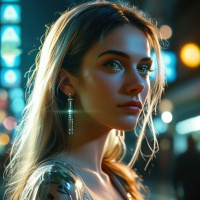 The image depicts a young woman with long hair gazing to her left. She has striking features, including large eyes and full lips. Her expression is neutral. She is wearing what appears to be a sequined or glittery garment, possibly part of an outfit that suggests she might be dressed for a formal event or a night out. The background is dimly lit with the lights of a city street, indicative of an urban setting during evening or nighttime hours.