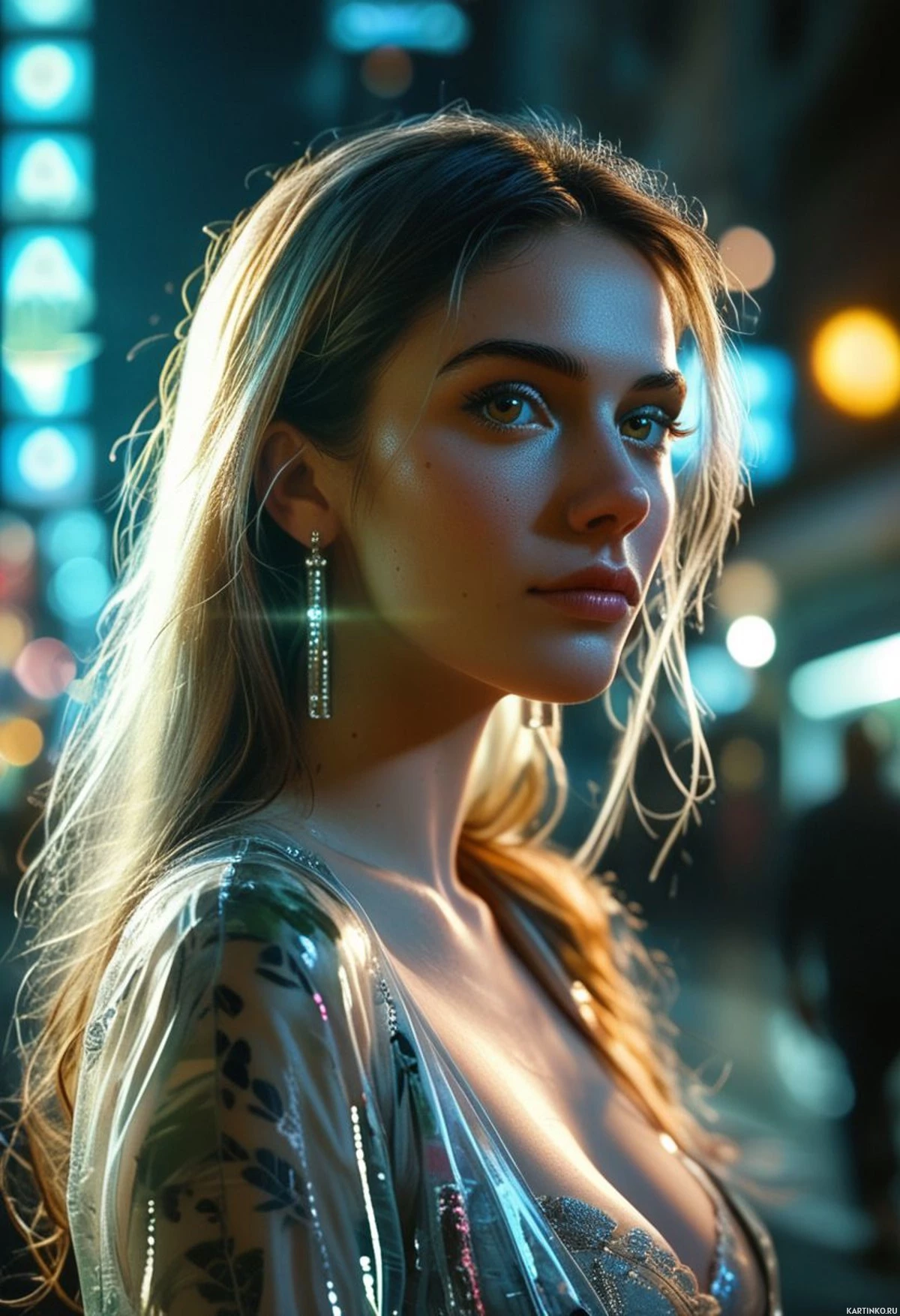 На картинке запечатлена молодая женщина с длинными волосами, смотрящая влево. У неё выразительные черты лица: большие глаза и пухлые губы. Выражение лица нейтральное. На ней, похоже, наряд, украшенный пайетками или блестками, возможно, часть костюма, подразумевающего торжественное мероприятие или вечерний выход. Фон приглушённый, с огнями городского освещения, что указывает на городскую обстановку в вечернее или ночное время.