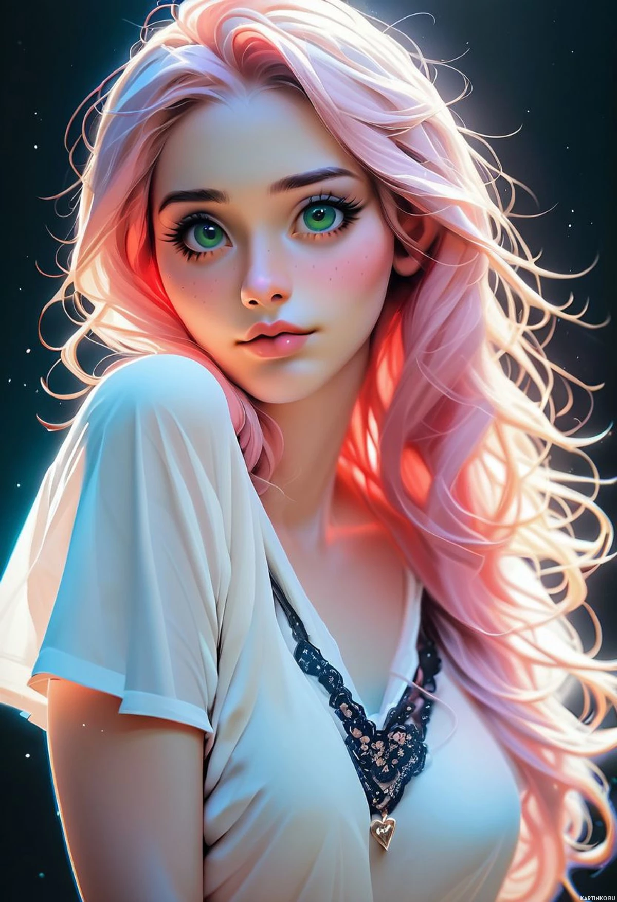 На картинке изображена трехмерный персонаж, девушка с розовыми волосами и поразительно голубыми глазами. У неё светлая кожа, взгляд направлен на зрителя, и на ней светлая рубашка, слегка расстегнутая у горловины, под которой виднеется кружевное бельё. Выражение лица нейтральное, с едва заметной улыбкой.