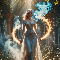 На картинке изображена девушка в доспехах и одежде, выполненных в стиле фэнтези, напоминающая волшебницу или чародейку, с длинными светлыми волосами. Она стоит на тропинке, окружённой зеленью, что указывает на древний лесной пейзаж. В правой руке она держит посох, с помощью которого направляет энергию или свет из левой руки, создавая вокруг него круговой эффект. Персонаж колдует или творит магию, о чём свидетельствуют голубые и белые облака дыма, исходящие из её палочки.