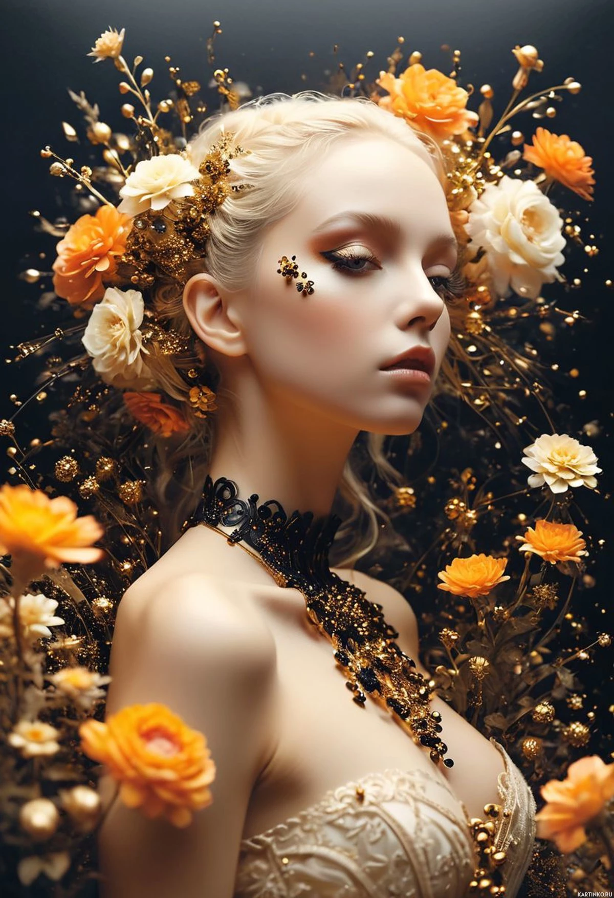 The image features a woman with blonde hair. She has flower decorations on her head and shoulders, predominantly composed of roses. The woman is gazing to the side with a neutral expression. Her attire includes what appears to be a gold or golden embellishment at her neckline. There are subtle floral details integrated into her clothing as well. The background is dark, which contrasts with the lighter tones of the flowers and her skin, highlighting her face and upper body.