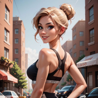 The image features a woman with blonde hair standing on a sidewalk in an urban environment. She is facing away from the camera, smiling over her shoulder. Her attire consists of tight-fitting black leggings and a sports bra that enhances her figure. There are buildings in the background with trees interspersed among them, suggesting she might be in a residential or mixed-use area. The sky is clear with visible clouds, indicating fair weather conditions at the time the photograph was taken.