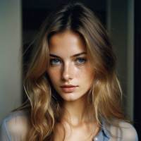 The image features a young woman with a neutral expression looking directly at the camera. She has shoulder-length hair and her complexion is fair. Her makeup includes defined eyebrows and lipstick, which adds to her poised appearance. She's wearing a light blue denim button-down shirt that appears to be open at the collar, revealing a hint of skin at the neckline. The background is nondescript with muted colors, focusing attention on the subject.