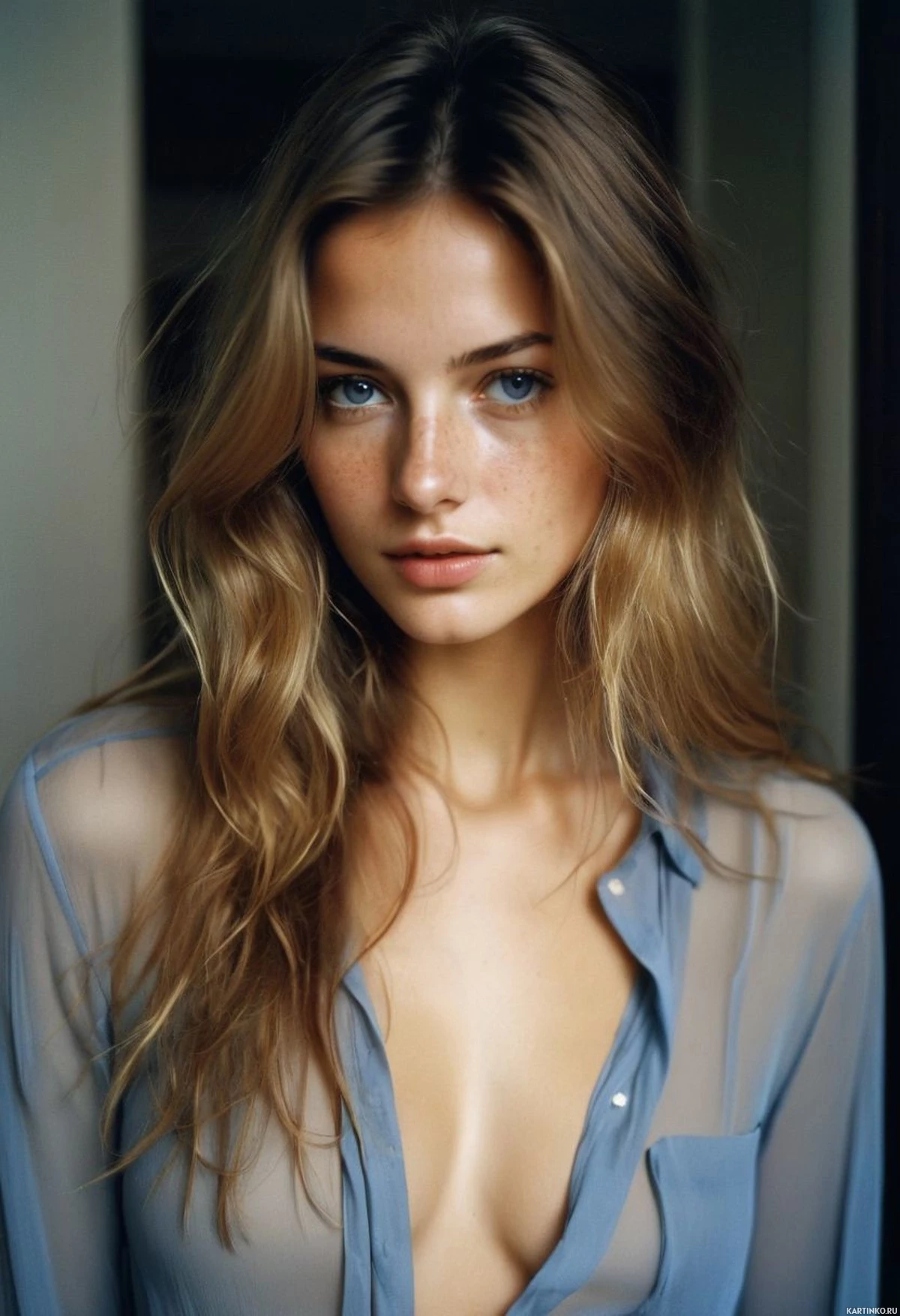 На картинке запечатлена молодая женщина с невозмущенным выражением лица, смотрящая прямо в камеру. У нее каштановые волосы до плеч и светлая кожа. Макияж подчеркивает ее брови и губы, создавая впечатление собранности и элегантности. Она одета в светлую джинсовую рубашку с закатанными рукавами, которая расстегнута у воротника, обнажая тонкую полоску кожи. Фон нейтральный, с приглушенными тонами, акцентирующий внимание на девушке.