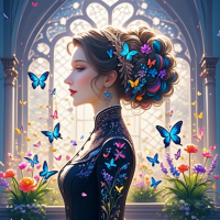 The image depicts a female character in an elaborate costume with a detailed and colorful design resembling flowers, butterflies, and possibly other nature elements. The character has a stylized appearance with prominent features such as large eyes, intricate hair adornments, and a distinctive hairstyle. She is looking towards the viewer, and her expression is neutral. In the background, there is an arched window or doorway allowing natural light to enter the scene and illuminate the surroundings. Various butterflies are flying around the character, adding a whimsical and magical feel to the composition. The color palette of the image is vibrant with rich greens, purples, and hints of gold and other colors that contribute to an enchanted or fantastical atmosphere.