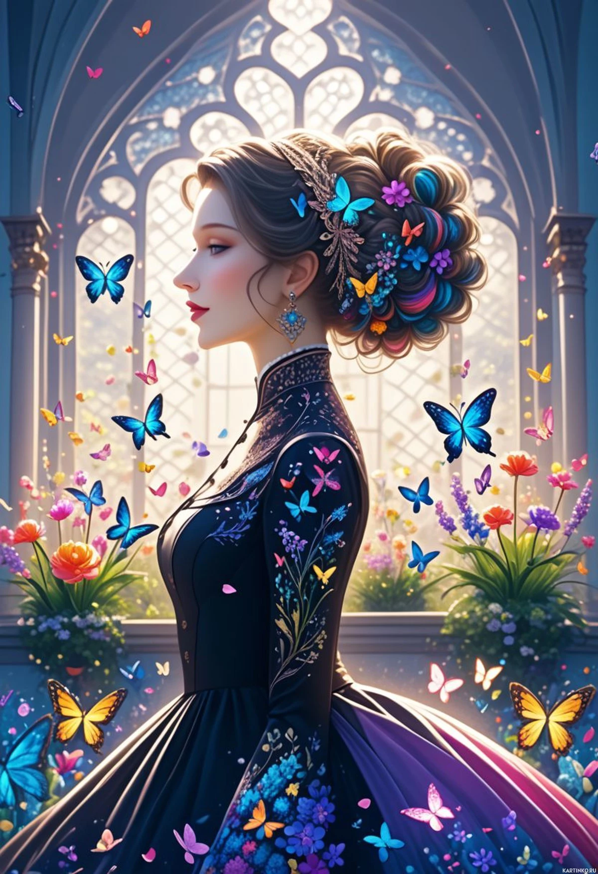 На картинке изображена женская фигура в сложном костюме с детальным и красочным дизайном, напоминающим цветы, бабочки и, возможно, другие элементы природы. У персонажа стилизованный облик с выразительными чертами: большие глаза, замысловатые украшения в волосах и оригинальная прическа. Она смотрит на зрителя с нейтральным выражением лица. На заднем плане – арочная дверь или окно, через которое проникает естественный свет, освещая пространство. Вокруг персонажа летают бабочки, создавая сказочное и волшебное настроение. Цветовая палитра картинки насыщенная: глубокие зеленые и фиолетовые оттенки с вкраплениями золота и других цветов, что придает ей очарованную и фантастическую атмосферу.