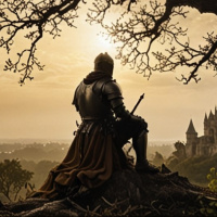 a contemplative expression. His armor and sword suggest he may be preparing for battle or has just returned from one. The background features