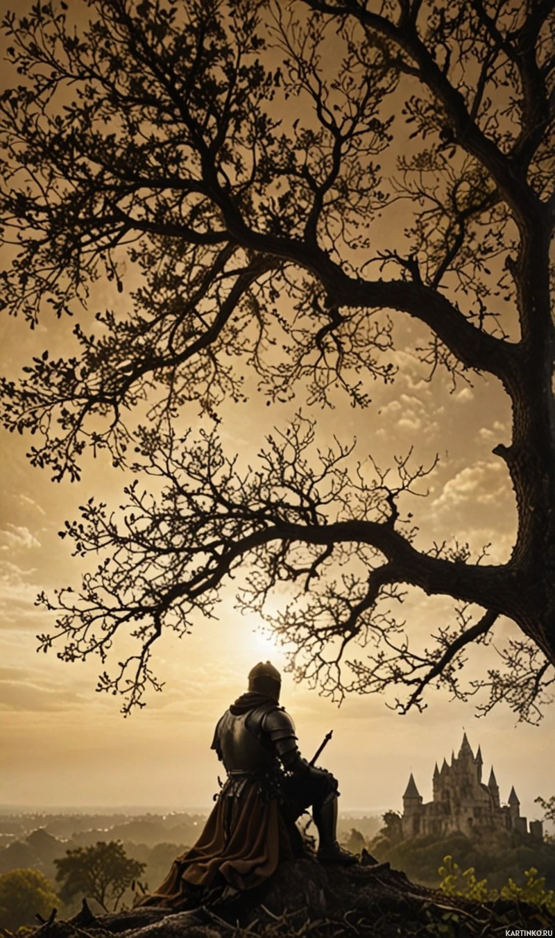 a large tree to the left of the figure, its branches reaching out towards the sky. The sun is setting behind the mountains in the distance, casting long shadows on the ground and painting the landscape with