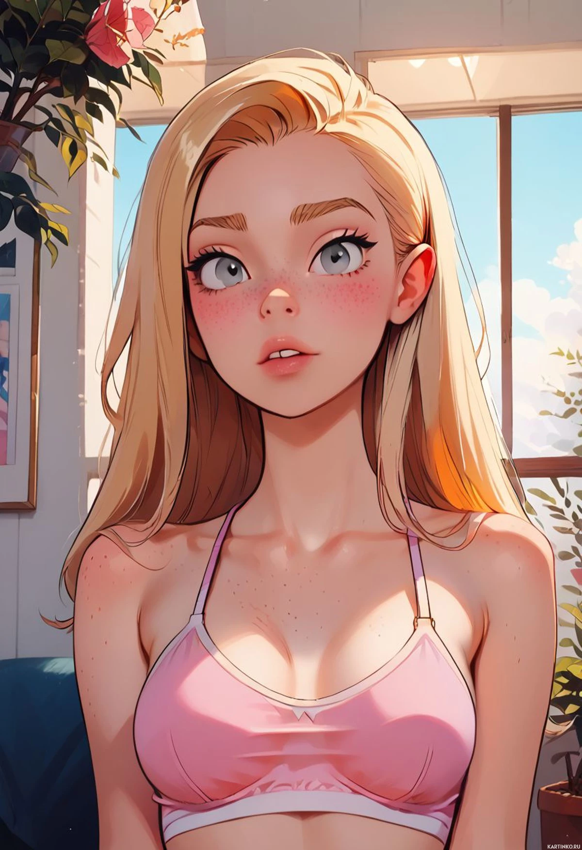 На картинке изображен трехмерный персонаж, похожий на молодую женщину с длинными светлыми волосами и голубыми глазами. У нее розовый блеск для губ, она одета в розовый топ с белыми деталями и сидит в помещении перед окном, из которого открывается вид на улицу. У нее светлая кожа, и она смотрит прямо на зрителя с нейтральным выражением лица. Стиль картинки указывает на то, что она может быть из видеоигры или цифрового арта, созданного для имитации человеческого персонажа в реалистичном стиле.