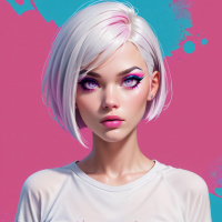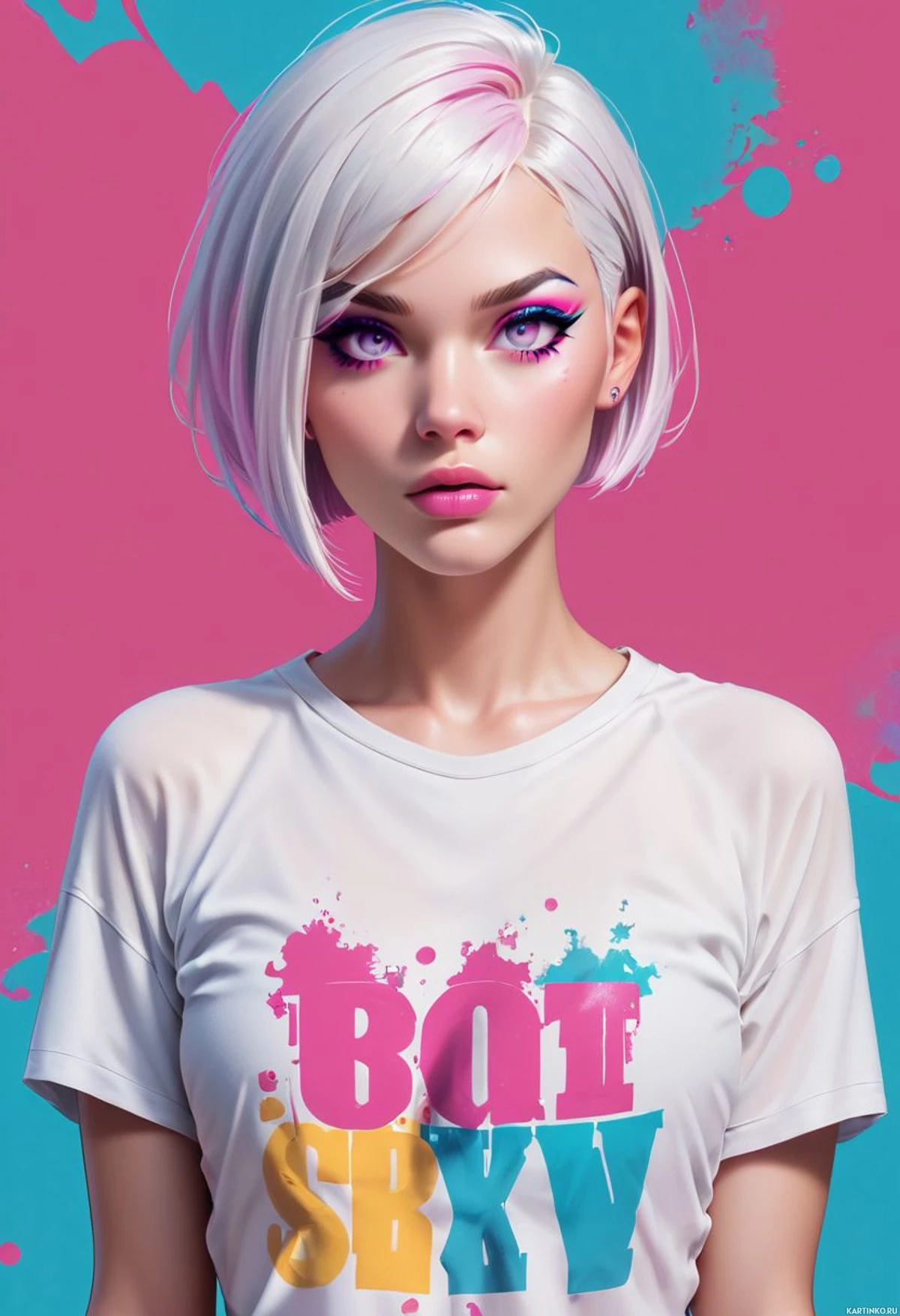 The image features a young woman with white hair styled into bangs and longer locks at the back. Her skin tone appears to be light, and she has striking blue eyes. She wears makeup that includes defined eyebrows, winged eyeliner, and a subtle pinkish hue on her lips. The woman is dressed in a casual style with a graphic T-shirt that has colorful splashes across it. The background of the photo is a plain surface with a gradient effect from deep to lighter shades of pink, which could be indicative of digital art or a stylized photograph editing technique. The overall feel of the image suggests a contemporary and vibrant aesthetic.