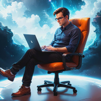 office chair, working on a laptop that sits open on his lap. He is wearing glasses and has