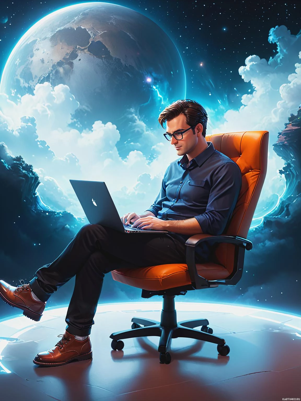 surrounding environment includes fantastical elements such as swirling clouds and a mystical glow that illuminates the man's surroundings. The overall style of the image is highly stylized with