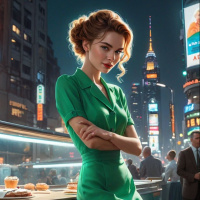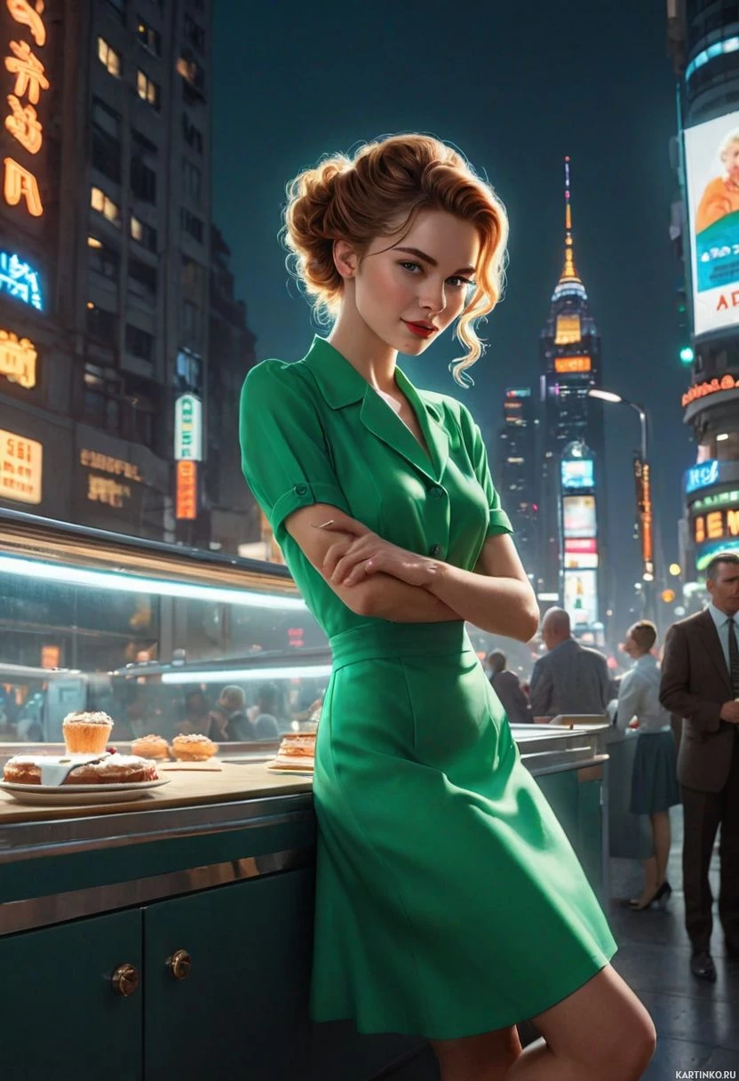 На картинке изображена женщина, стоящая на фоне, напоминающем ночную городскую улицу. У неё рыжие волосы, уложенные небрежными волнами, и она одета в зеленое платье до колена с подвернутыми рукавами. Руки скрещены на груди, что придает позе защищенности или уверенности. Женщина смотрит прямо в камеру с серьезным выражением лица. На заднем плане виднеется улица с освещенными вывесками и зданиями, создающими атмосферу городского пейзажа, вероятно, отсылающего к Нью-Йорку.