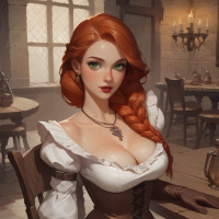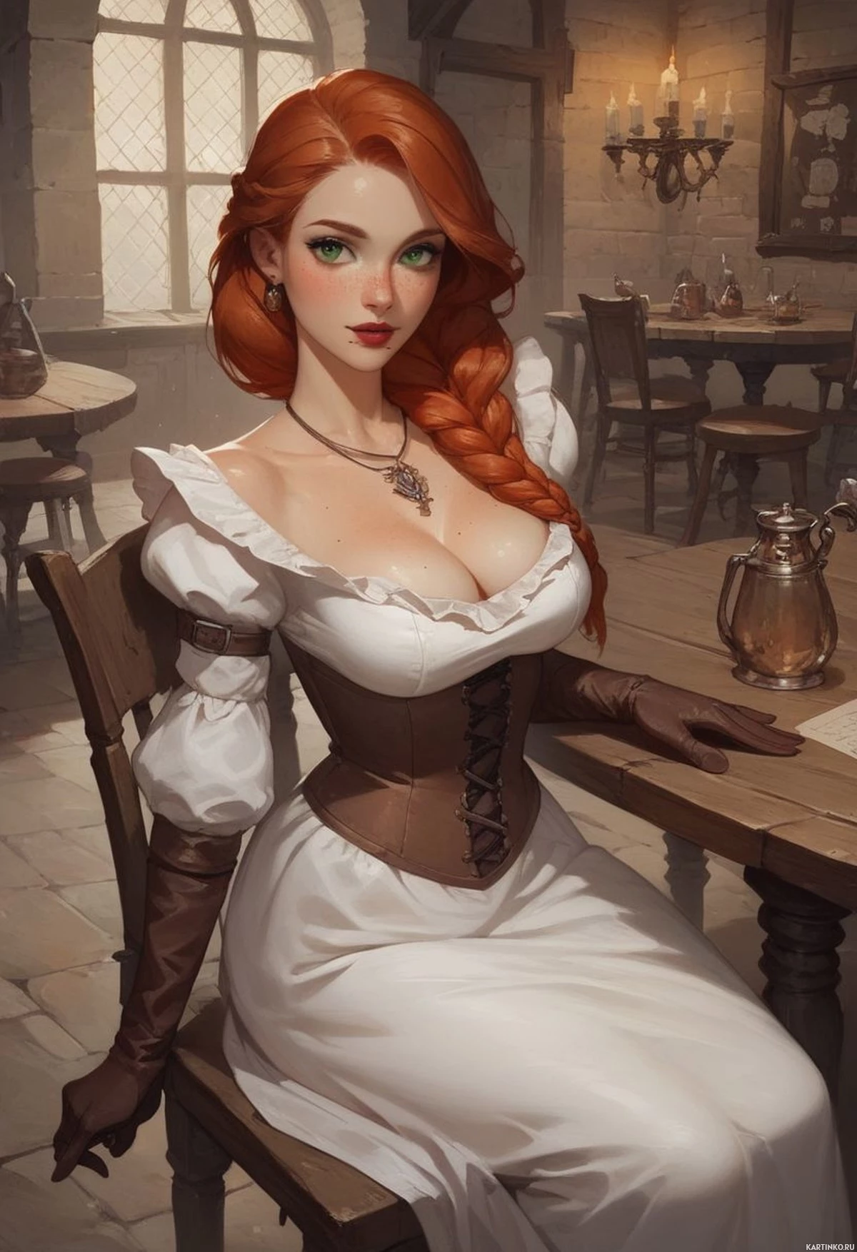 На картинке изображена девушка с ярко-рыжими волосами. На ней наряд, который отсылает к исторической или фэнтезийной эпохе: белое платье с кружевом и корсетом, а также элементы кожаной брони на руках и плечах. Выражение ее лица исполнено тихой сосредоточенности или задумчивости. На заднем плане – интерьер таверны с деревянной мебелью и теплой, уютной атмосферой, что подчеркивается игрой света и тени.