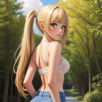 The image depicts a character from behind, showing only their back and shoulders. This character appears to be a female with long blonde hair in a side-parted style, secured with a ponytail holder. She is wearing a sleeveless top that exposes her midriff and jean shorts. The character's pose suggests movement or action, as if she has just finished running or dancing and is looking back over her shoulder. The background features what appears to be an outdoor setting with trees under a blue sky with some clouds.