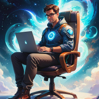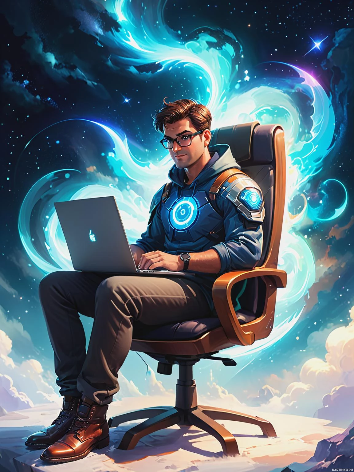 a serene atmosphere. Behind the man, there are dynamic swirling patterns resembling clouds or smoke, and streaks of what appears to be energy or light emanating from his body or possibly the laptop itself. These elements give the image an otherworldly or superhero-like quality. The overall tone is fantasy with a hint of realism due to the detailed rendering of the man's features.