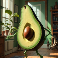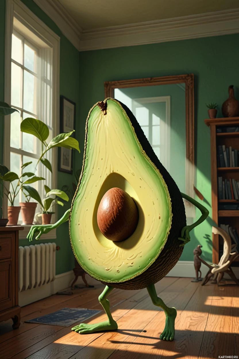На картинке изображён трёхмерный персонаж-авокадо, стоящий на двух ногах, как человек. В центре авокадо — крупное ядро, напоминающее голову мультяшного персонажа с глазами, ртом и носом. Шкурка авокадо текстурирована, будто это одежда или костюм. У основания — пара зелёных листьев с черешком, похожая на руки. На заднем плане видна комната с деревянным полом и мебелью, включая книжные полки и зеркало.