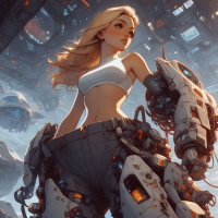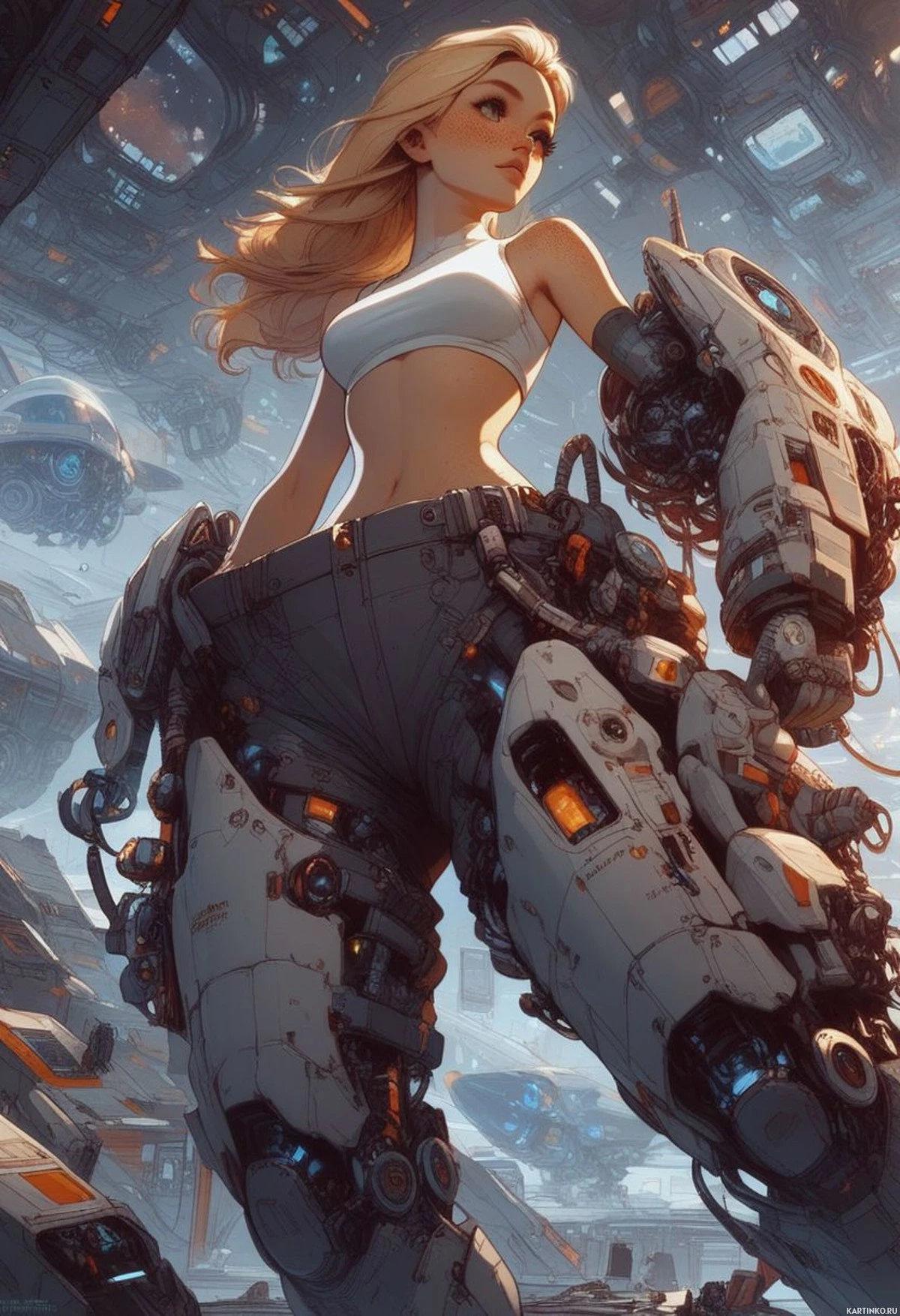 На картинке изображена девушка с светлыми волосами в футуристической броне. Она опирается руками на, похоже, нагрудник своего костюма, который металлический и имеет видимые механические элементы. Окружающий пейзаж указывает на научно-фантастическую тематику, возможно, это космический корабль или футуристическая среда.