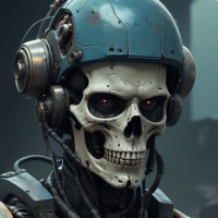 The image features a figure that appears to be a blend of robotics and human anatomy. The central focus is a skull, which has been integrated with electronic components, giving it the appearance of a cyborg or a synthetic being. The figure's head is encased in a blue structure that could be part of its electronic system or armor. It is wearing what seems to be an industrial or military-style suit, adorned with various attachments and wires. The background is dark and nondescript, which helps draw attention to the figure at the center. The style of the image suggests it could be related to science fiction themes, possibly depicting a scene from a movie or a piece of conceptual art representing advanced robotics.