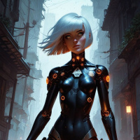 The image features a female character with white hair standing in what appears to be a science fiction setting. She is wearing a tight-fitting black suit with orange and yellow accents that could suggest a futuristic or robotic design. Her pose is confident, with one hand on her hip and the other hanging by her side. The character is set against an urban backdrop that looks worn and aged, possibly indicative of a dystopian environment or a scene from a science fiction narrative.