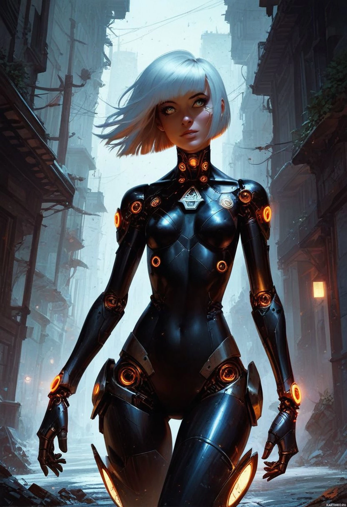 На картинке изображена женщина с белыми волосами, стоящая на фоне научно-фантастического окружения. На ней облегающий чёрный костюм с оранжевыми и жёлтыми деталями, которые могут намекать на футуристический или роботизированный дизайн. Её поза уверенная: одна рука лежит на бёдрах, другая свободно свисает. На заднем плане – обветшалый городской пейзаж, создающий ощущение антиутопической среды или сцену из научно-фантастического сюжета.