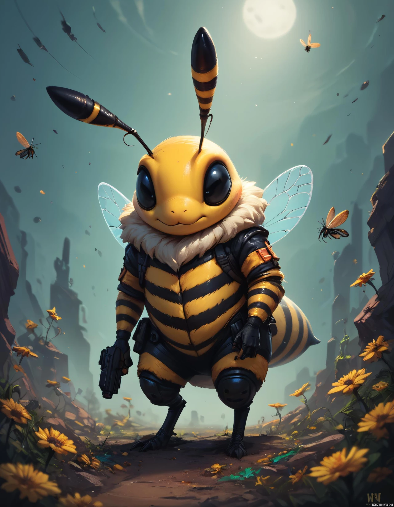 На картинке изображен антропоморфный пчелиный персонаж, стоящий в фантастическом пейзаже. На пчеле, кажется, надета броня, состоящая из сегментов, похожих на человеческую. У него большие, выразительные глаза. В правой руке он держит, по всей видимости, оружие или инструмент, слегка поднятый над бедерм. На заднем плане видны высокие, скалистые утесы под лунным небом, вокруг летают насекомые. Внизу картинки также заметны цветы. Общий стиль работы предполагает сочетание фэнтези и научной фантастики.
