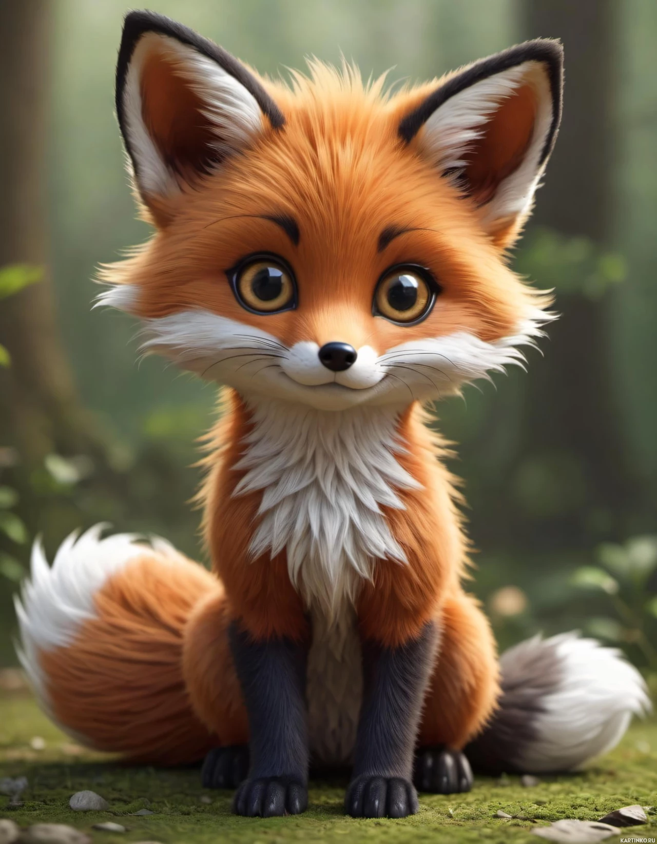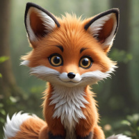 A digitally rendered image of a fox with human-like eyes and fur, sitting on what appears to be a forest floor. The fox has a somewhat anthropomorphic expression, as indicated by its eyes looking directly at the viewer and its mouth forming an inviting smile.