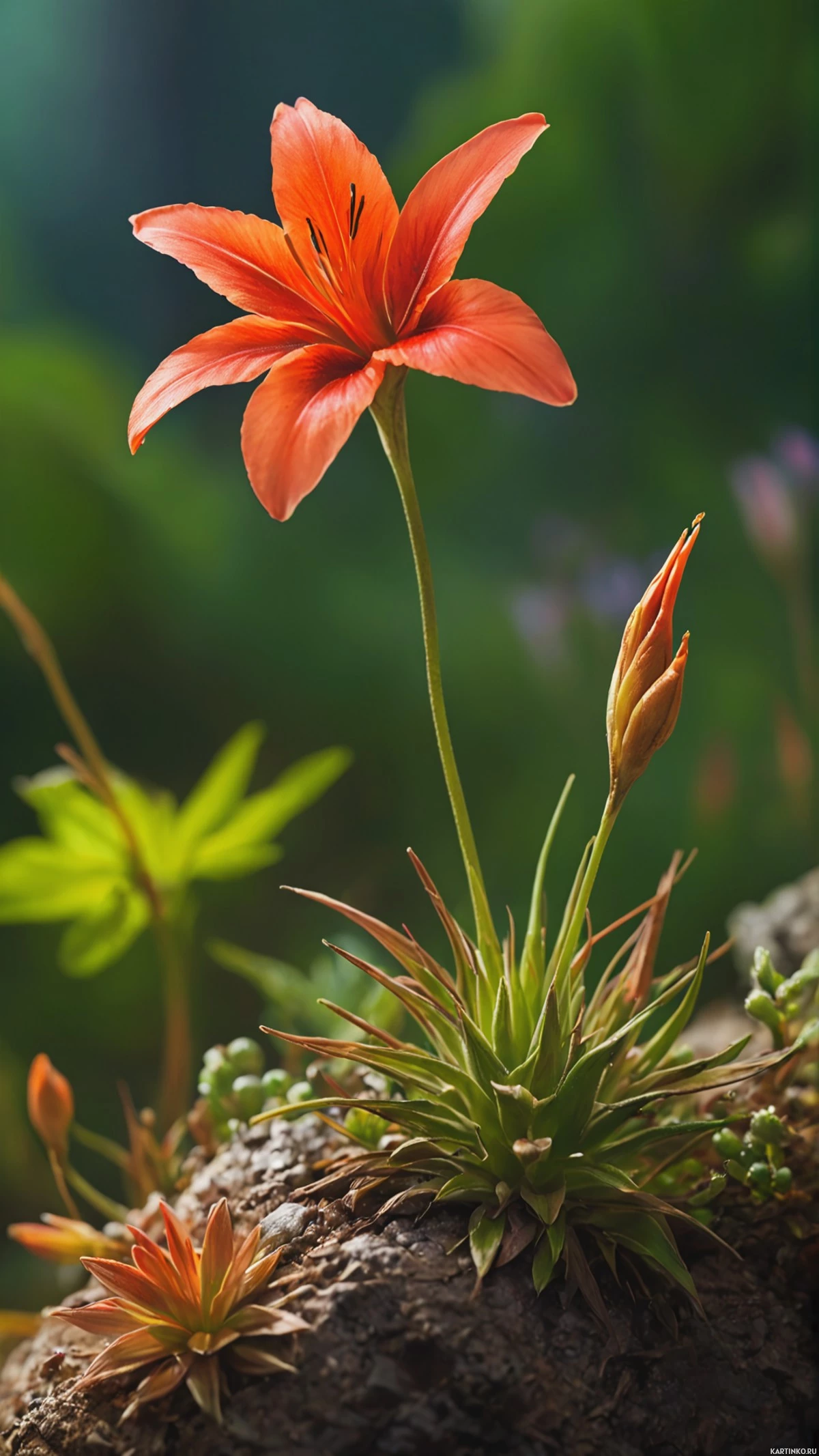 the visual appeal of the flowers, which are placed near smaller plants and stones, indicating a thriving ecosystem. The overall style of the illustration is detailed and realistic with a touch of