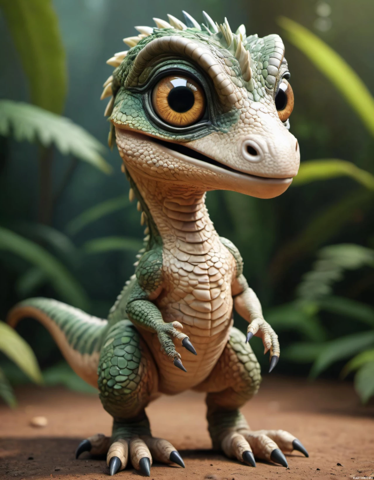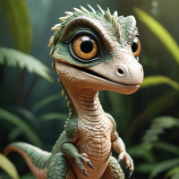 The image features an anthropomorphic dinosaur character standing upright on two legs. It has a friendly appearance with large, expressive eyes and a small mouth that is slightly open in a cheerful expression. The character's body resembles a typical dinosaur but with more human-like features; it has short arms and hands that are positioned by its sides. The background suggests a jungle or forest setting with dense vegetation and a dark, overcast sky, providing a naturalistic environment for the character.
