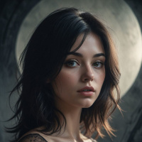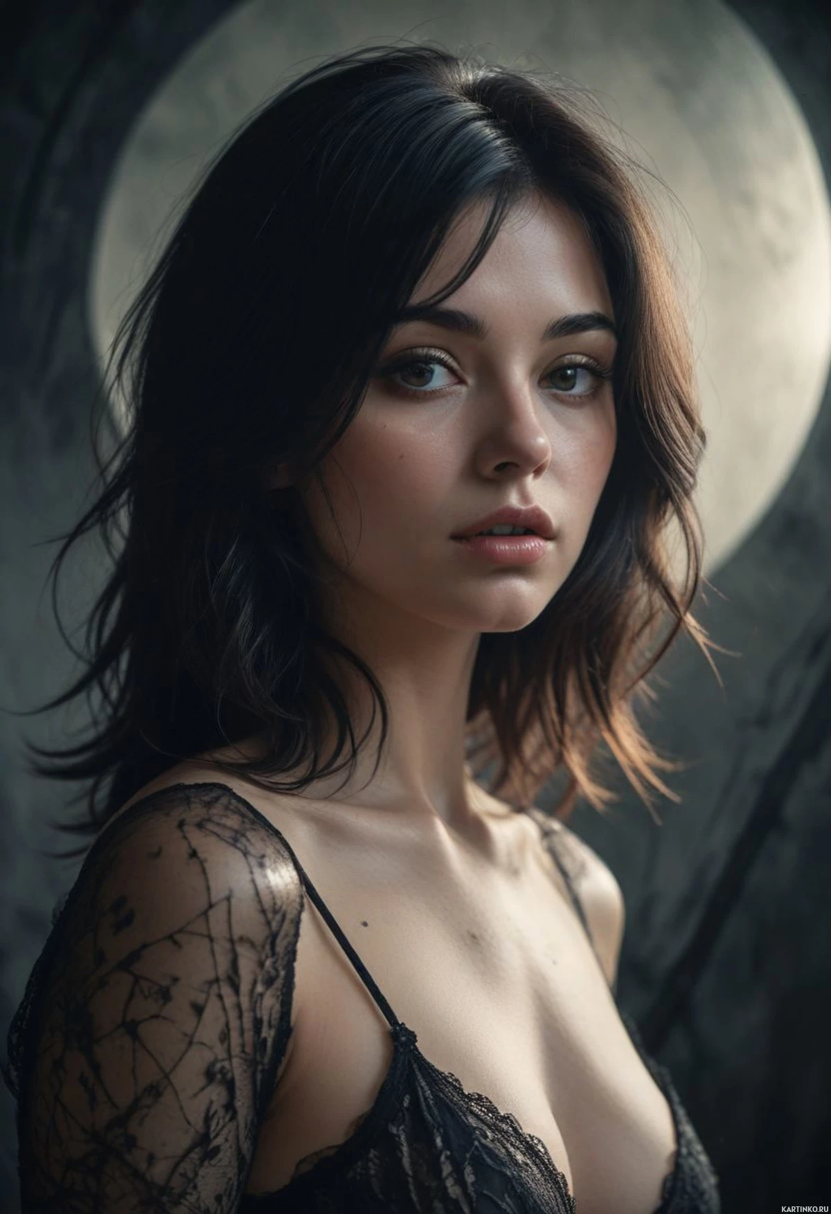 The image features a young woman with medium-length hair, styled in waves that fall just past her shoulders. Her complexion appears fair, and she has a neutral expression on her face. She is wearing lingerie with black lace detailing. There are visible elements of a night sky or possibly a moon in the background, contributing to an ethereal or mystical ambiance. The woman's gaze is directed off to the side, away from the viewer.