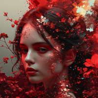 In this image, there is a young woman with dark hair styled in an updo. She has fair skin and is wearing what appears to be red lipstick. Her eyes are looking slightly away from the camera, giving her a contemplative expression. On her shoulders, there is a floral pattern that includes cherry blossoms in full bloom. The background consists of darker shades with hints of red and pink, possibly flower petals or an abstract design. There is a subtle gradient effect near the top edge of the image, transitioning from dark to light tones.
