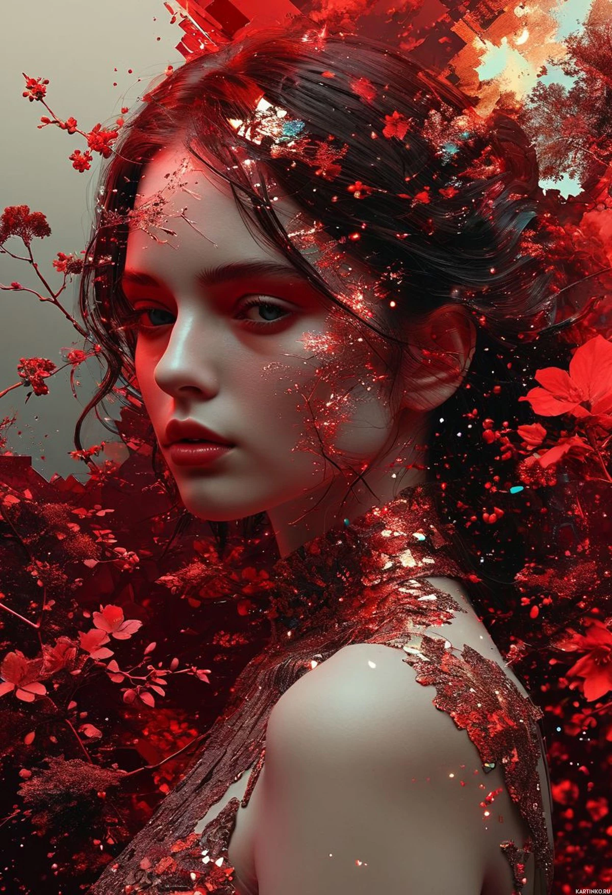 На картинке запечатлена молодая женщина с темными волосами, собранными в пучок. У неё светлая кожа и, кажется, красная помада. Взгляд её направлен немного в сторону от камеры, создавая задумчивое выражение. На плечах – цветочный узор с цветущей вишнёй. Фон выполнен в тёмных тонах с намёками на красный и розовый, возможно, лепестки цветов или абстрактный рисунок. В верхней части картинки заметный градиент, переходящий от тёмного к светлому.