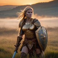 The image features a woman dressed as a warrior from ancient times. She has long blonde hair and is wearing a sleeveless armor that resembles ancient Greek or Roman garb, complete with intricate designs and what appears to be a crest or insignia on her chest. She also carries a sword in one hand and a shield in the other. Her pose suggests she might be ready for battle or guarding an area. The background shows a dramatic sunset with silhouettes of mountains, and there's a misty haze over the landscape that gives the scene a serene yet majestic atmosphere.