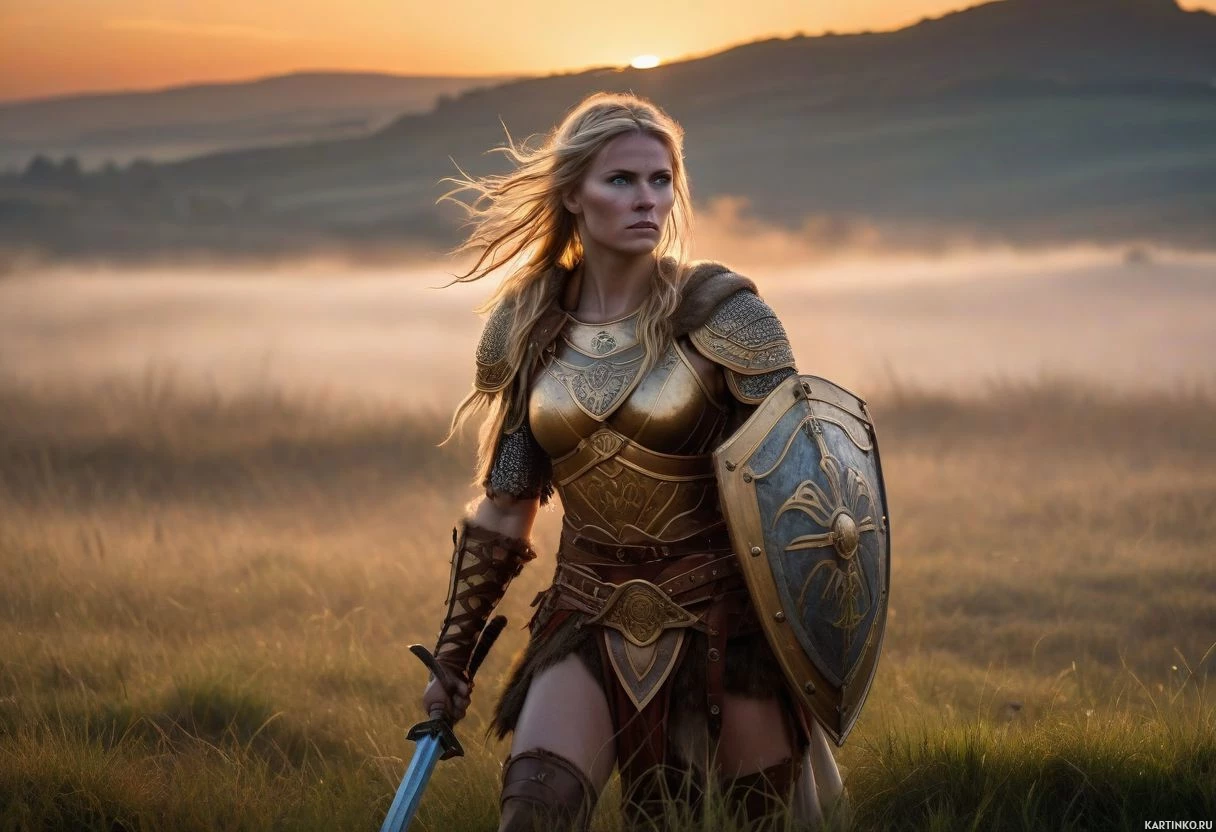 На картинке изображена женщина, облачённая в доспехи воительницы из древности. У неё длинные светлые волосы, а на ней – безрукавная броня, напоминающая одежду древних греков или римлян, с замысловатыми узорами и, похоже, с гребнем или символикой на груди. В одной руке она держит меч, в другой – щит. Поза говорит о готовности к бою или охране территории. На заднем плане – драматичный закат с силуэтами гор, а над пейзажем висит туманная дымка, создающая умиротворяющую, но величественную атмосферу.