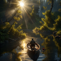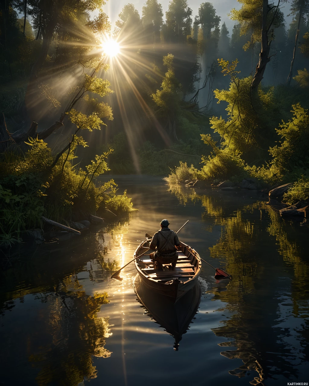 a tranquil scene of a man rowing in a small boat on a river. He is sitting facing away from the viewer, and there's an oar visible with him holding it. Surrounding him are trees that show signs of autumn with