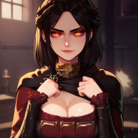 На картинке изображена девушка с длинными черными волосами и красными глазами, выполненная в стиле аниме или фэнтези. На ней темный наряд, включающий топ в стиле корсет и накинутый на плечи плащ. Она стоит, положив руки на бедра, с уверенной осанкой. За ней виднеется комната с приглушенным освещением, возможно, лаборатория или мастерская алхимика, судя по стеллажу с пробирками и различным приспособлениям. На полу рядом с ней светится магический символ.