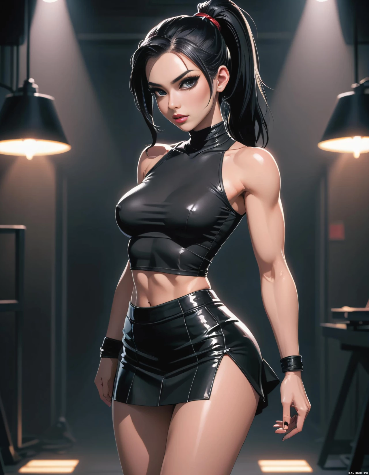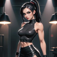 На картинке изображена девушка, стоящая в помещении, напоминающем игровую зону – на стене видна приставка или компьютерный экран. На ней чёрный кожаный комплект из топа и шорт. Волосы у неё уложены так, что закрывают лоб и падают на плечи, с пробором набок. Она стоит уверенно, руки на бёдрах, ноги слегка расставлены.