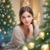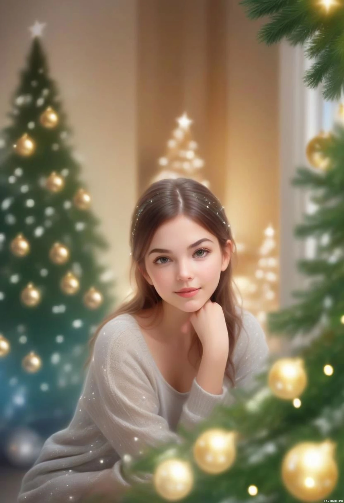 На картинке женщина сидит перед елкой. Она облокотилась подбородком на руку и смотрит прямо в камеру с легкой улыбкой. У нее длинные волосы, голубые глаза и серый свитер. На заднем плане – несколько украшенных елок, некоторые из которых украшены золотыми игрушками. По фону видно, что это комната, украшенная к праздникам.