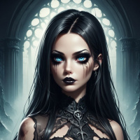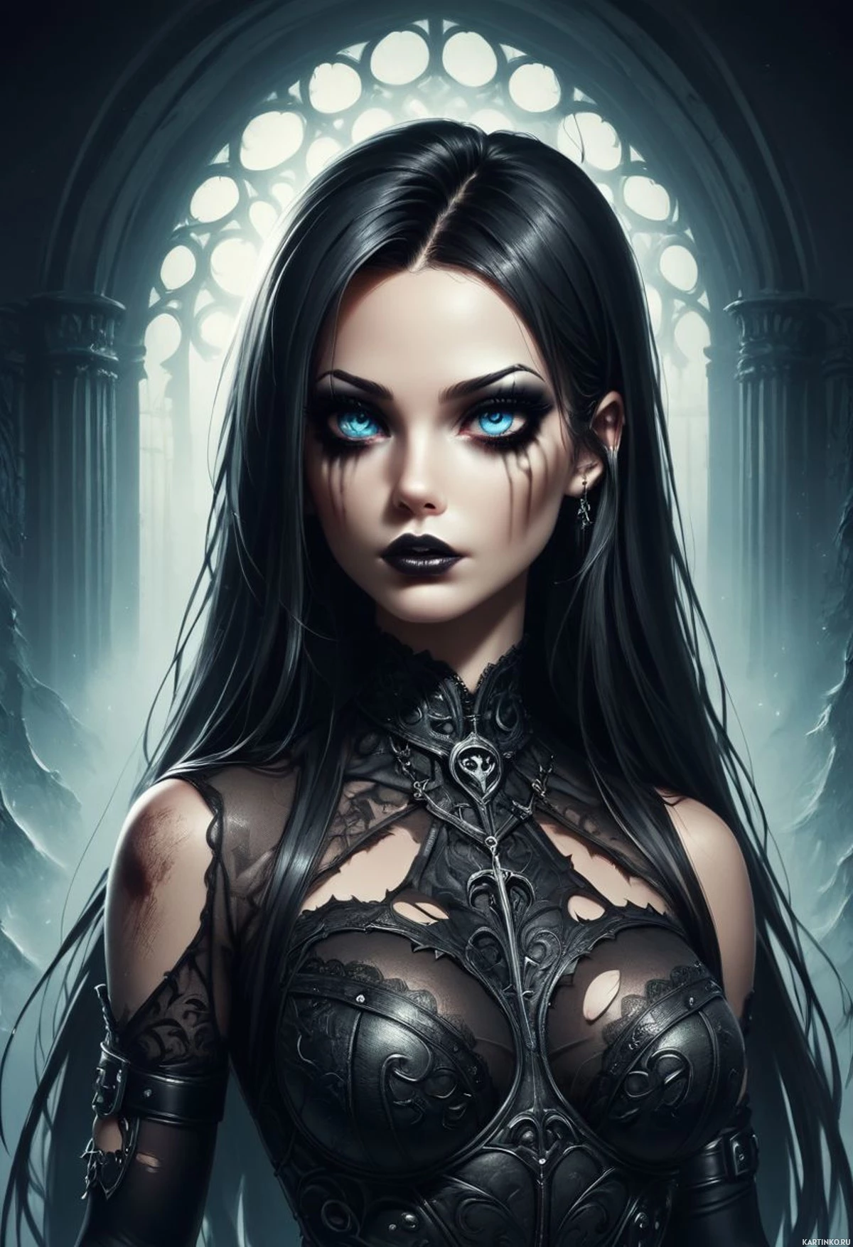 Картинка изображает стилизованную женскую фигуру с пронзительными голубыми глазами и темными волосами. На ее лице – жутковатое, почти безжизненное выражение. Она одета в черный корсет с замысловатым декором, украшенный кружевом или филигранью. На шее виднеется подвеска или талисман, возможно, напоминающий паука или похожего существа. Фон – мрачная и таинственная обстановка, намекающая на готическую или призрачную тематику. Здесь видны готические арки, которые могут указывать на дверной проем или вход в запретное или загадочное место. Освещение в картинке создает призрачную атмосферу, усиливая зловещую атмосферу сцены. Поза персонажа спокойная и выдержанная, но в ее выражении чувствуется намек на злобу или опасность. Общая композиция призвана вызывать ощущение потусторонности и, возможно, сверхъестественных сил.
